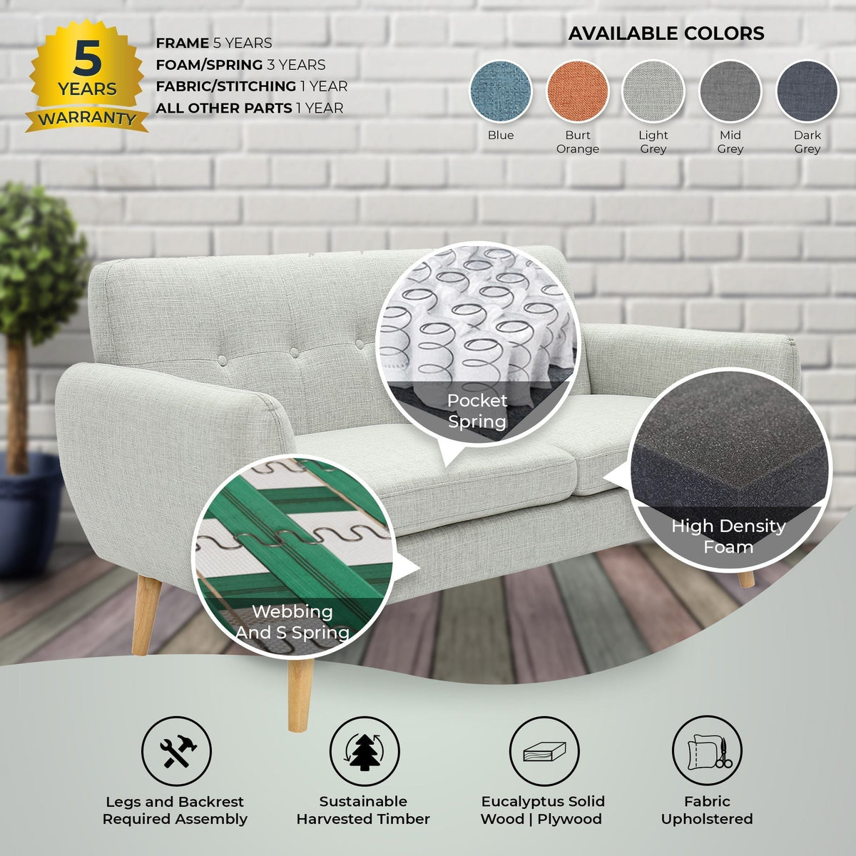 A sofa is the focal point of a living room. Place this beautiful sofa set that consists of a 1-piece 3-seater sofa and a 2-piece 2-seater sofa, designed in the Scandinavian style, in your living room to fill it with elegance. This sofa set is an epitome of superb craftsmanship. They showcase comfy looks, featuring tapered legs and outwardly sloping arms. They have a fixed backrest with button details and loose-style seat cushions with high-density foam for superior comfort. The sofas in light grey mix easily with any interior decor style. The entire sofa is upholstered in 100% polyester fabric, which is soft and durable. The stunning sofas also feature high-density foam, webbing, pocket springs, and S-springs that ensure complete relaxation for the body. The structural frame of the sofa is made of sustainably harvested solid wood and plywood, which gives it internal strength and resilience. The frame has a five-year warranty; the foam and springs have a three-year warranty; the fabric and stitching have a one-year warranty; and all other parts have a one-year warranty.