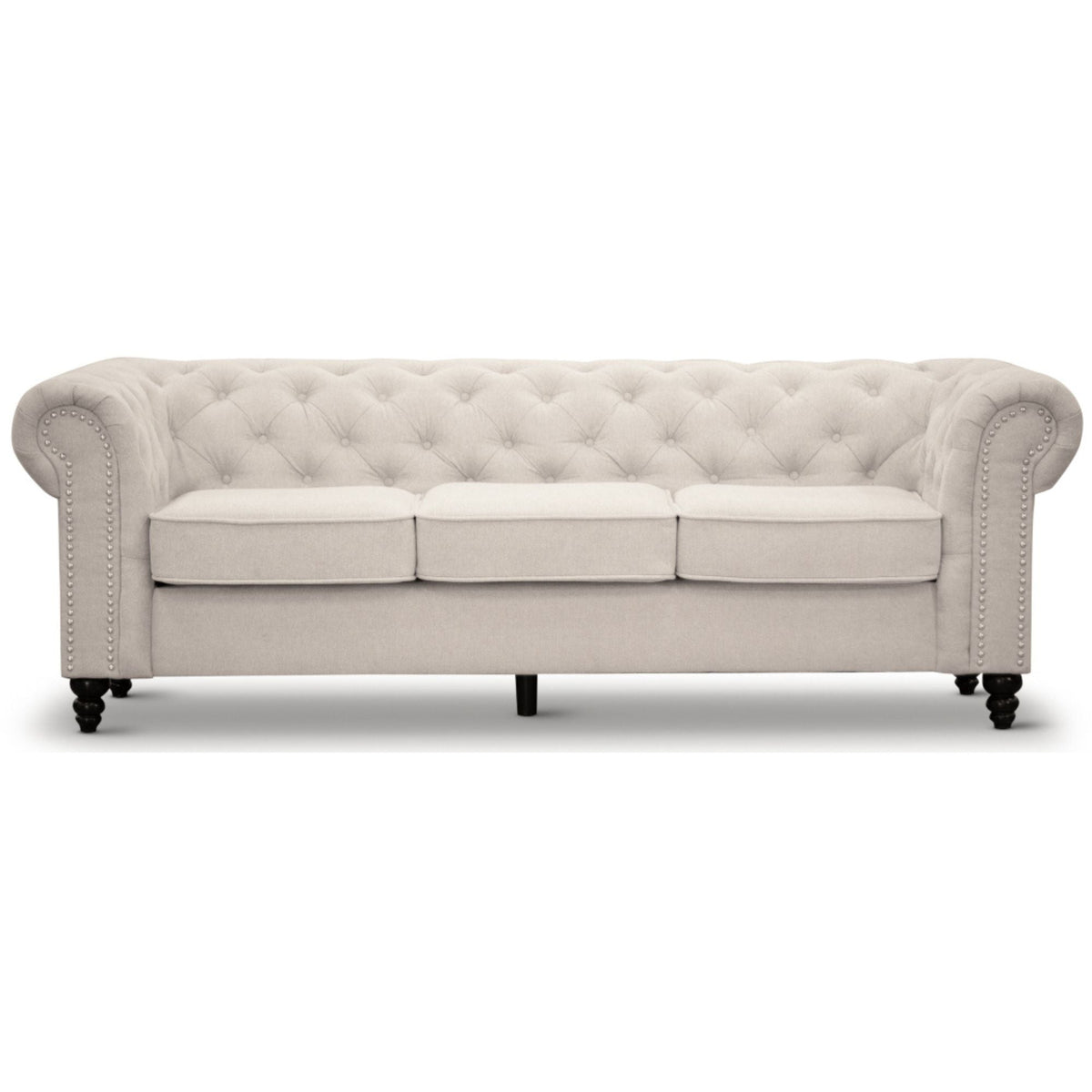 A cool sofa that showcases the best of furniture design. Place this beautiful sofa, designed in a Classic Chesterfield style, in your living room to turn the area into the most stylish corner of the house. The design epitomises sophisticated living effortlessly. The gorgeous 3-seater sofa features button tufting and traditional rolled arms with studding detail. They have beautiful cushioning for added comfort, and they are upholstered in a perfect mix of polyester and nylon fabric in a beige colour. The colour blends easily with any interior decor style. The stunning sofas also feature strong, timber legs in an artistic design, high-density foam, and zig-zag springs that ensure ultimate relaxation for the body. The structural frame of the sofa is made of sustainably harvested plywood and hardwood, which gives it the internal strength it requires. The frame has a five-year Warranty; the foam and springs have a three-year Warranty; the fabric and stitching have a one-year Warranty; and all other parts have a one-year Warranty.