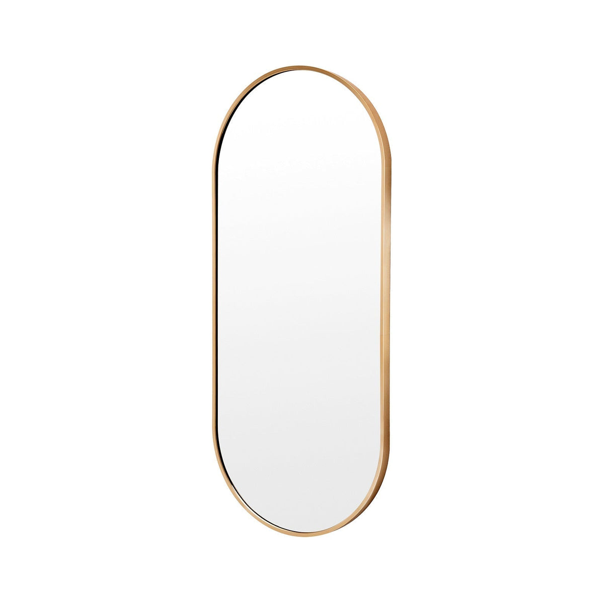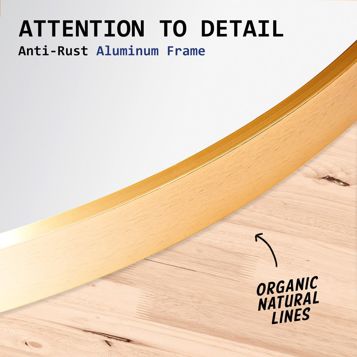 Please note it's neither brass gold nor rose gold. Our aluminum mirror, part of the gold color theme, has a unique shade within the gold spectrum. The frame color may vary with light due to aluminum's reflective nature.