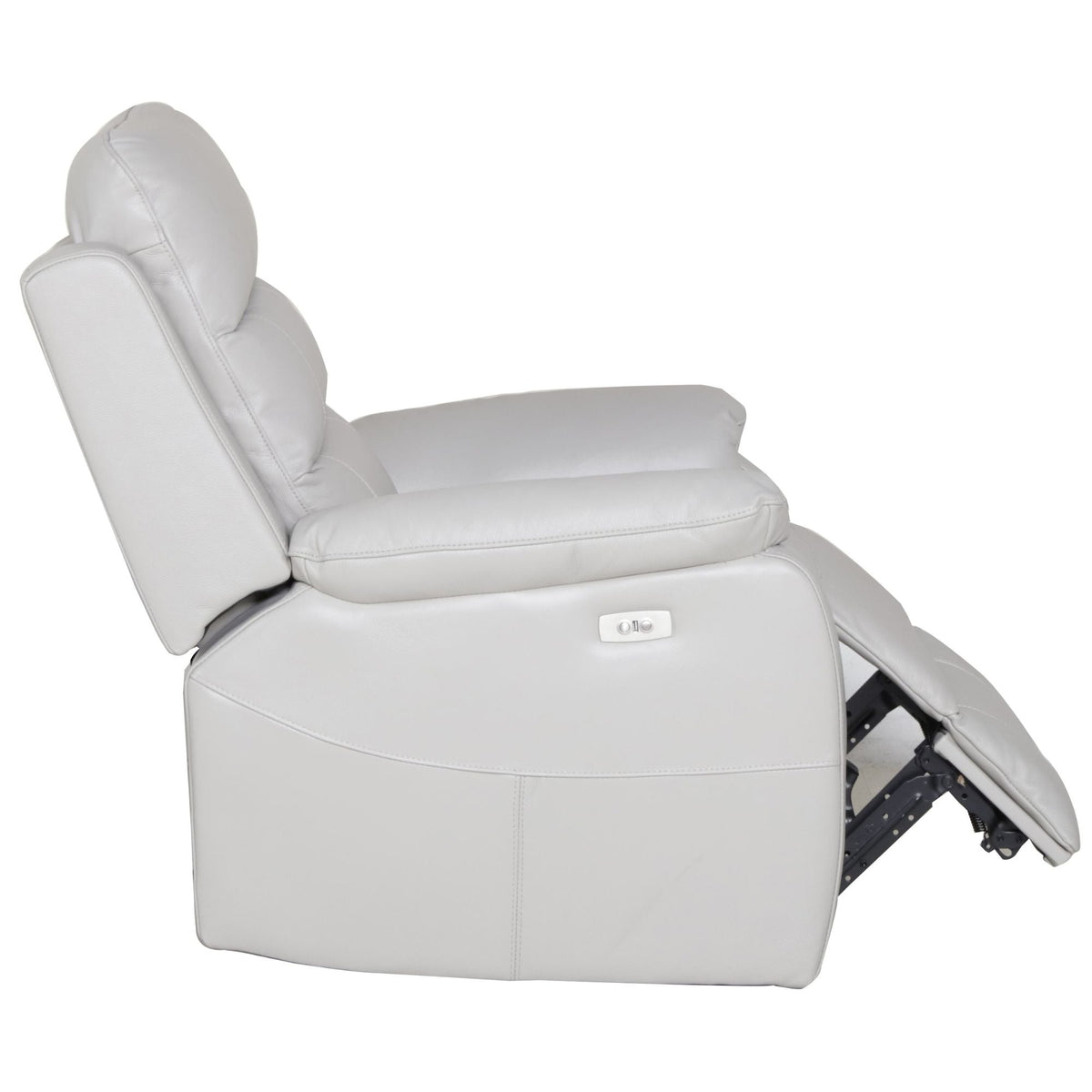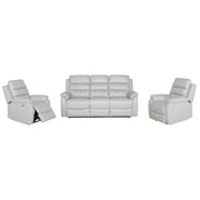 This awesome lounge setting, which includes two single-seater electric recliners and one three-seater lounge with two electric recliners and one comfortable armless chair, transforms your living room into a cool, relaxing resort. Its grandeur is enhanced by a magnificent light grey shade. The lounge setting, designed in the modern style, is an epitome of brilliant craftsmanship. It features a modular setting that consists of a left-arm electric recliner, an armless chair, and a right-arm electric recliner. It has a USB charger port for your devices. It also features generous seating and back cushions for neck and lumbar support, high backs, and wide pillow top arms. The lounge is upholstered in super-comfy thick leather.The lounge's seat and back cushions are made of high-density foam, which gives them a welcoming look and a long-lasting shape. Thick foam, webbing, pocket springs, and S-Springs ensure added comfort. The lounge's hard plastic foot pad prevents its lower parts from scratching or damaging the flooring. The entire structural frame of the lounge setting is composed of plywood and solid wood, giving it the strength, it needs. The frame has a five-year warranty; the foam and springs have a three-year warranty; the fabric and stitching have a one-year warranty; the recliner mechanism and electric parts have a one-year warranty; and all other parts have a one-year warranty.